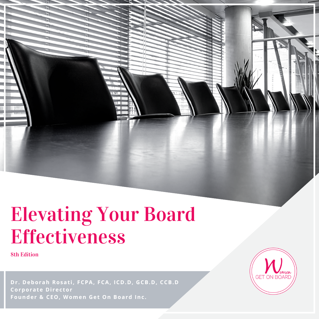 When corporate boards have gender diversity, businesses see better results. For example, a Canadian study of 6,000 boards found that gender-balanced boards have more varied viewpoints and lead to higher effectiveness and decreased financial irregularities. That’s why Women Get On Board Inc.’s (WGOB) mandate is to connect, promote and empower women to corporate boards. This e-book on Elevating Your Board Effectiveness builds on that mandate. Building on Deborah Rosati’s first e-book How to Get Yourself On a Board, Elevating Your Board Effectiveness provides practical insights, intelligence and tools to empower women with the skills and confidence to lead and serve on boards.